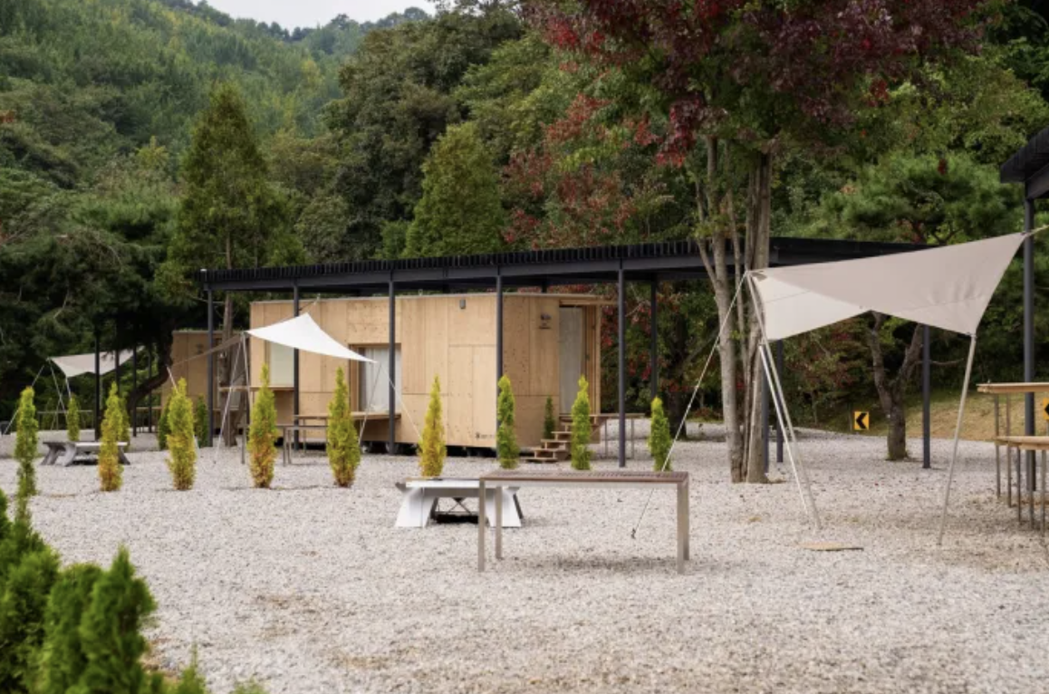 텐트 사이트 외에도 미니멀 캐빈 숙소가 함께 운영되며, 목재의 따뜻한 느낌과 넓은 유리창을 통해 자연을 그대로 담아낸 구조는 마치 숲 속의 힐링 하우스에 머무는 듯한 느낌을 줍니다.
