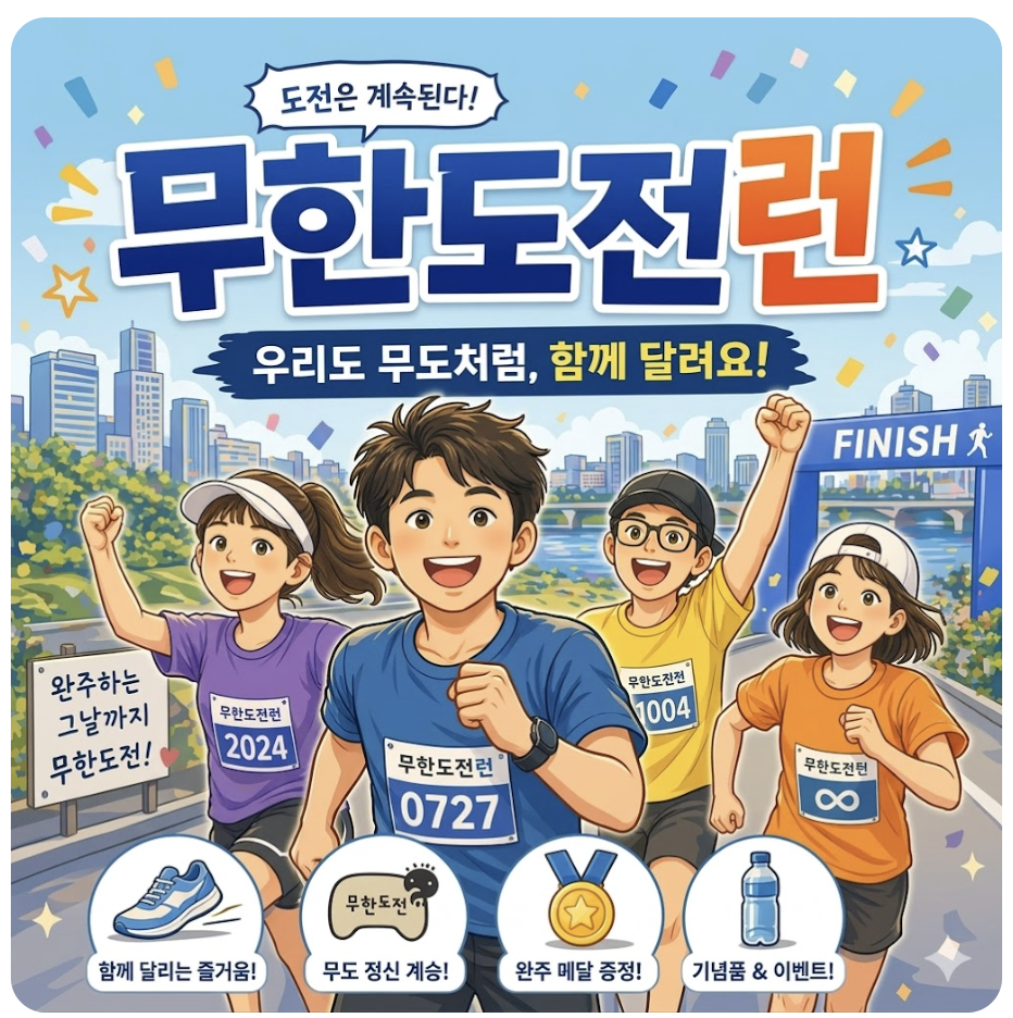 단순한 운동을 넘어 하나의 문화가 된 무한도 전런! 런데이 앱으로 체력을 기르고, 6월 오프라인 대회에서 그 기량을 뽐내보시는 건 어떨까요? 이번 2026 무도런이 여러분의 일상에 무한한 에너지가 되길 바랍니다.