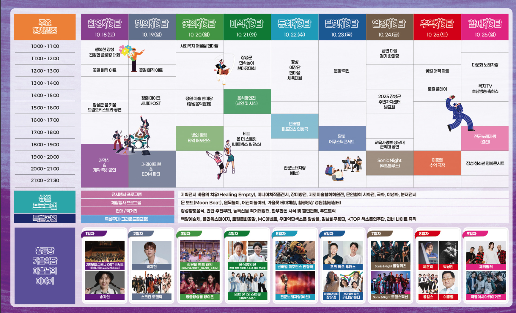 2025년 장성 황룡강 가을꽃축제는 10월 18일(토)부터 10월 26일(일)까지 총 9일간 펼쳐집니다. 가을의 절정기에 맞춰 열리는 이 축제는 매년 수많은 관광객이 찾는 장성의 대표 행사로, 올해 역시 다채로운 프로그램이 준비되어 있습니다.