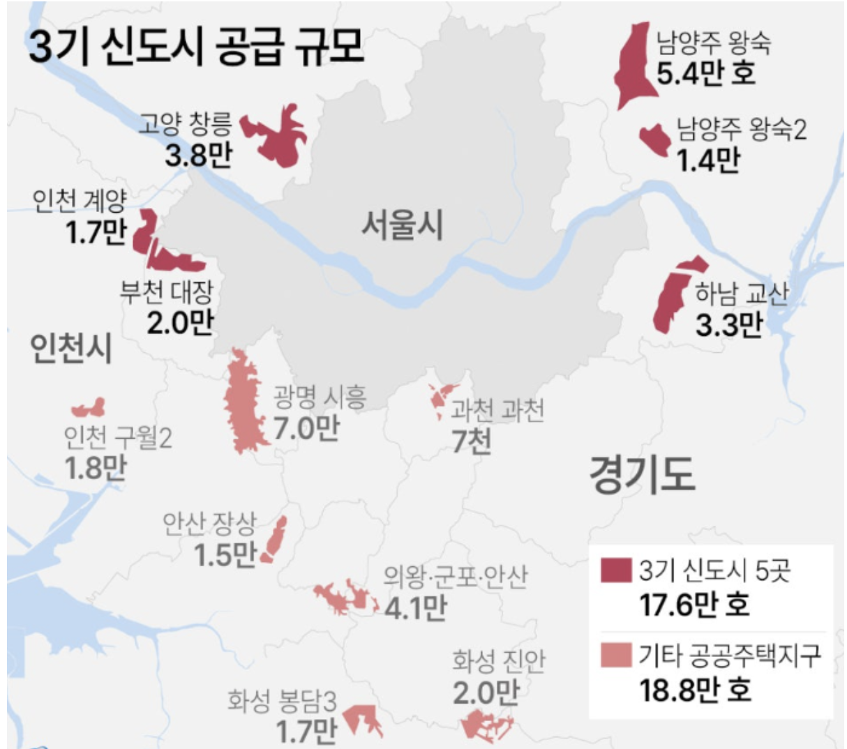 2025년까지 본격적인 분양 및 입주가 시작될 예정이며, 현재까지 발표된 주요 3기 신도시의 계획 공급량은 다음과 같습니다: